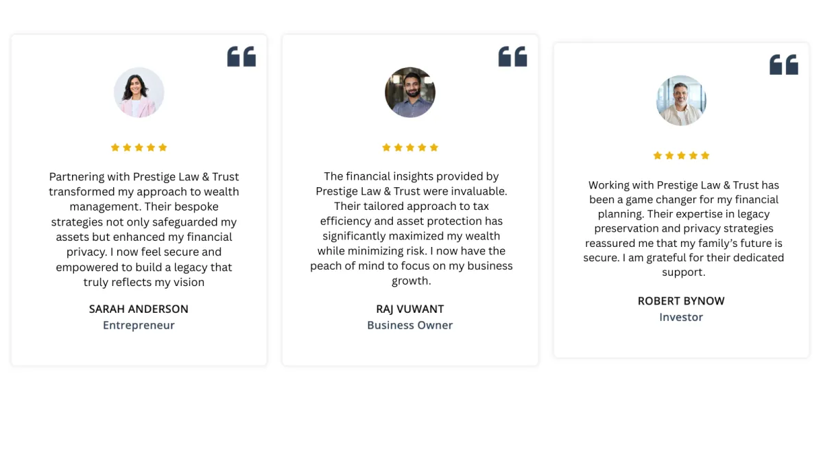 Prestige Law & Trust specializes in creating robust financial architectures that not only protect your assets but also optimize your financial legacy. Experience a transformative approach to wealth management that empowers you to preserve your privacy, enhance taxation efficiency, and secure a lasting impact for generations to come.